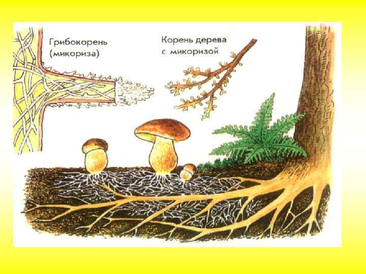 Шляпочные грибы Питание грибов Основная масса шляпочных грибов — сапротрофы, но встречаются и паразиты (например, опенок). Шляпочные грибы часто вступают в симбиотические отношения с корнями высших растений, особенно древесных, образуя микоризу — грибокорень. Грибница при этом оплетает корни деревьев, грибы получают от растений органические вещества, растения — воду и минеральные соли. Для многих грибов такой симбиоз обязателен, так как их грибница может развиваться и без участия корней дерева, но плодовые тела в этом случае не образуются.