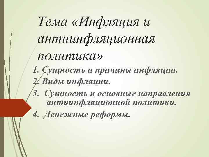 Тема «Инфляция и антиинфляционная политика» 1. Сущность и причины инфляции. 2. Виды инфляции. 3. Сущность и основные направления антиинфляционной политики. 4. Денежные реформы.