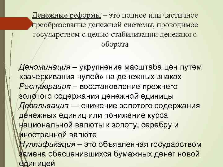 Денежные реформы – это полное или частичное преобразование денежной системы, проводимое государством с целью стабилизации денежного оборота Деноминация – укрупнение масштаба цен путем «зачеркивания нулей» на денежных знаках Реставрация – восстановление прежнего золотого содержания денежной единицы Девальвация — снижение золотого содержания денежных единиц или понижение курса национальной валюты к золоту, серебру и иностранной валюте Нуллификация – это объявленная государством замена обесценившихся бумажных денег новой единицей