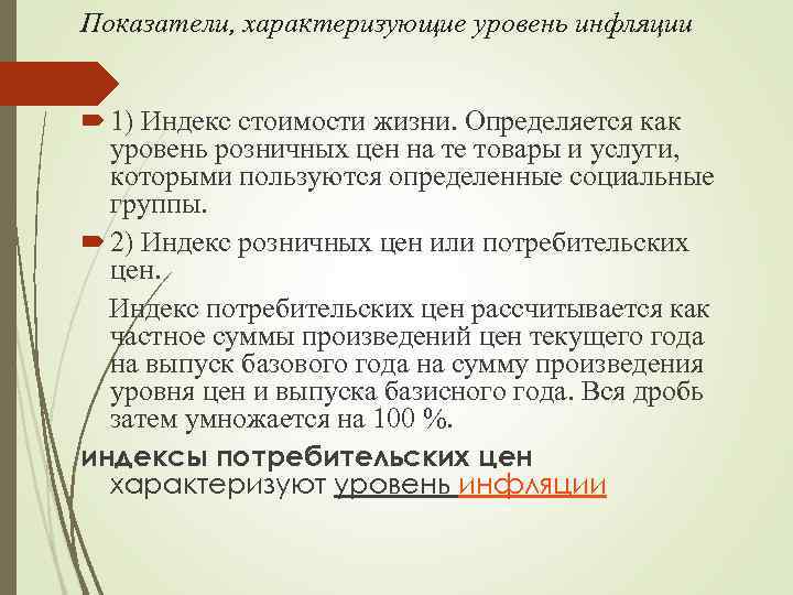 Показатели, характеризующие уровень инфляции 1) Индекс стоимости жизни. Определяется как уровень розничных цен на те товары и услуги, которыми пользуются определенные социальные группы. 2) Индекс розничных цен или потребительских цен. Индекс потребительских цен рассчитывается как частное суммы произведений цен текущего года на выпуск базового года на сумму произведения уровня цен и выпуска базисного года. Вся дробь затем умножается на 100 %. индексы потребительских цен характеризуют уровень инфляции