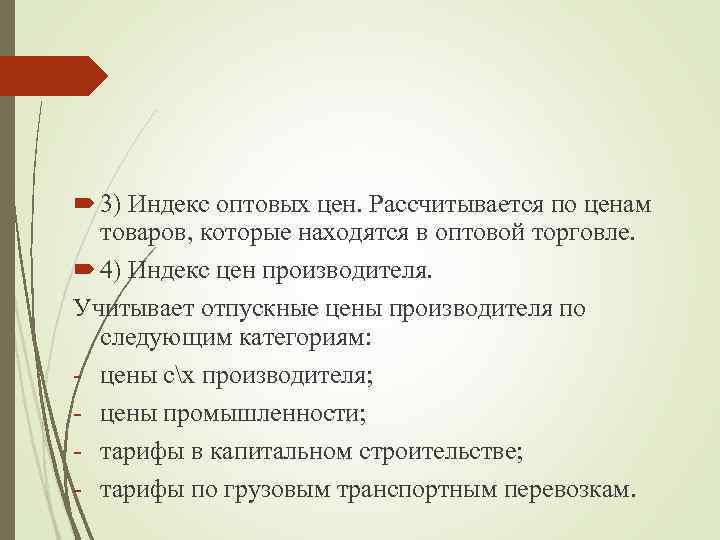 3) Индекс оптовых цен. Рассчитывается по ценам товаров, которые находятся в оптовой торговле. 4) Индекс цен производителя. Учитывает отпускные цены производителя по следующим категориям: - цены сх производителя; - цены промышленности; - тарифы в капитальном строительстве; - тарифы по грузовым транспортным перевозкам.