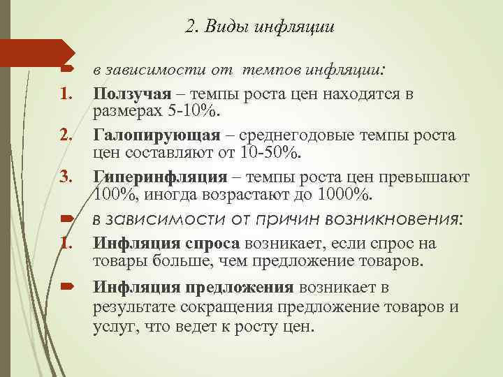 2. Виды инфляции в зависимости от темпов инфляции: 1. Ползучая – темпы роста цен находятся в размерах 5 -10%. 2. Галопирующая – среднегодовые темпы роста цен составляют от 10 -50%. 3. Гиперинфляция – темпы роста цен превышают 100%, иногда возрастают до 1000%. в зависимости от причин возникновения: 1. Инфляция спроса возникает, если спрос на товары больше, чем предложение товаров. Инфляция предложения возникает в результате сокращения предложение товаров и услуг, что ведет к росту цен.