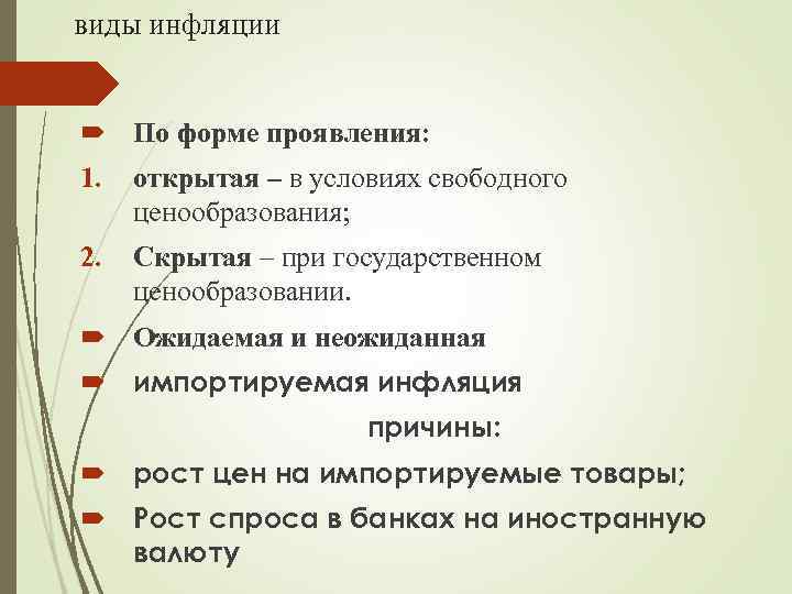 виды инфляции По форме проявления: 1. открытая – в условиях свободного ценообразования; 2. Скрытая – при государственном ценообразовании. Ожидаемая и неожиданная импортируемая инфляция причины: рост цен на импортируемые товары; Рост спроса в банках на иностранную валюту