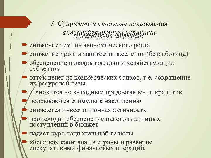 3. Сущность и основные направления антиинфляционной политики Последствия инфляции снижение темпов экономического роста снижение уровня занятости населения (безработица) обесценение вкладов граждан и хозяйствующих субъектов отток денег из коммерческих банков, т. е. сокращение их ресурсной базы становится не выгодным предоставление кредитов подрываются стимулы к накоплению снижается инвестиционная активность происходит обесценение налоговых и иных поступлений в бюджет падает курс национальной валюты «бегства» капитала из страны и развитие спекулятивных финансовых операций.