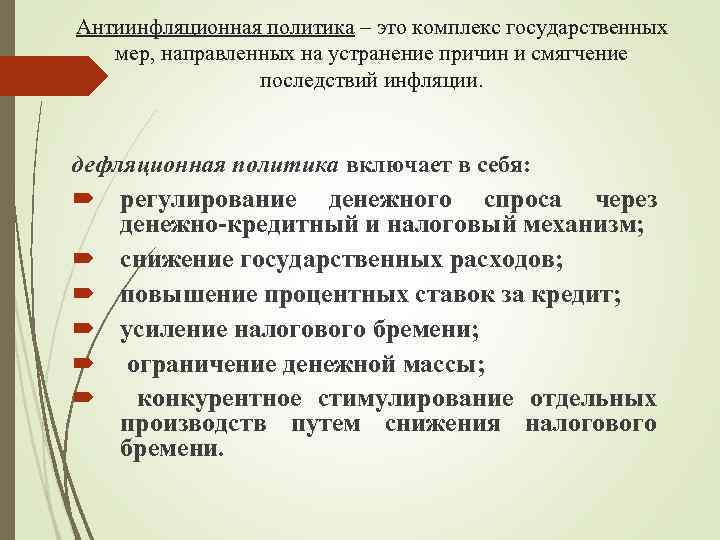 Антиинфляционная политика – это комплекс государственных мер, направленных на устранение причин и смягчение последствий инфляции. дефляционная политика включает в себя: регулирование денежного спроса через денежно-кредитный и налоговый механизм; снижение государственных расходов; повышение процентных ставок за кредит; усиление налогового бремени; ограничение денежной массы; конкурентное стимулирование отдельных производств путем снижения налогового бремени.