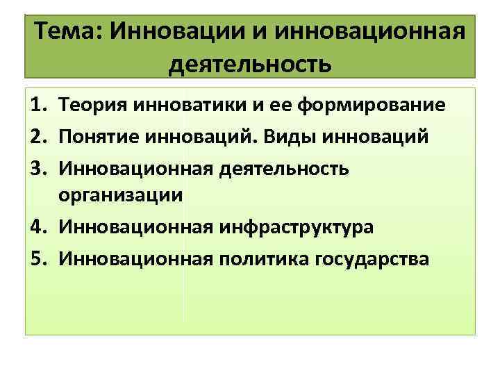 Тема: Инновации и инновационная деятельность 1. Теория инноватики и ее формирование 2. Понятие инноваций. Виды инноваций 3. Инновационная деятельность организации 4. Инновационная инфраструктура 5. Инновационная политика государства