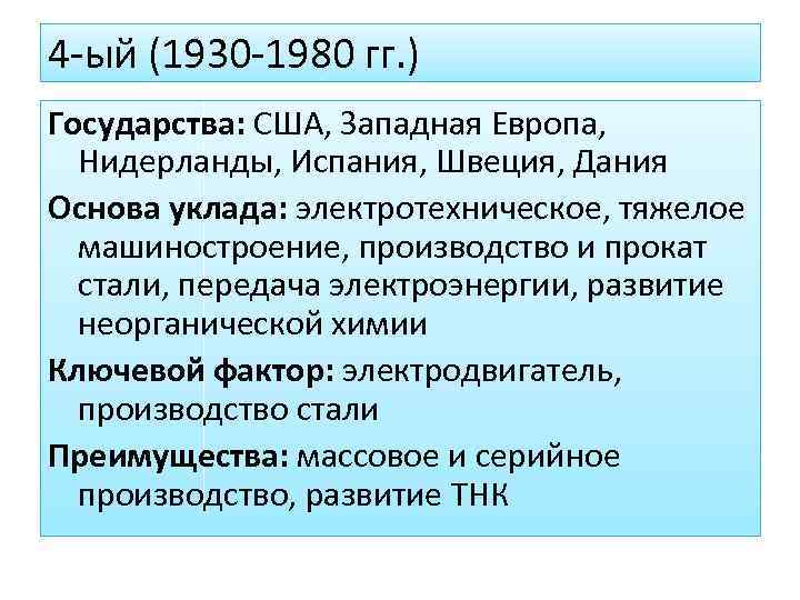 4 -ый (1930 -1980 гг. ) Государства: США, Западная Европа, Нидерланды, Испания, Швеция, Дания Основа уклада: электротехническое, тяжелое машиностроение, производство и прокат стали, передача электроэнергии, развитие неорганической химии Ключевой фактор: электродвигатель, производство стали Преимущества: массовое и серийное производство, развитие ТНК