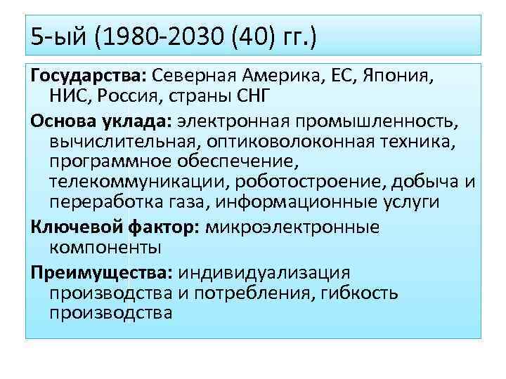 5 -ый (1980 -2030 (40) гг. ) Государства: Северная Америка, ЕС, Япония, НИС, Россия, страны СНГ Основа уклада: электронная промышленность, вычислительная, оптиковолоконная техника, программное обеспечение, телекоммуникации, роботостроение, добыча и переработка газа, информационные услуги Ключевой фактор: микроэлектронные компоненты Преимущества: индивидуализация производства и потребления, гибкость производства