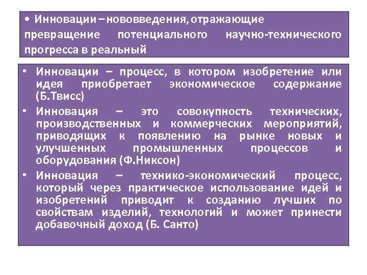 • Инновации – нововведения, отражающие превращение потенциального научно-технического прогресса в реальный • Инновации – процесс, в котором изобретение или идея приобретает экономическое содержание (Б. Твисс) • Инновация – это совокупность технических, производственных и коммерческих мероприятий, приводящих к появлению на рынке новых и улучшенных промышленных процессов и оборудования (Ф. Никсон) • Инновация – технико-экономический процесс, который через практическое использование идей и изобретений приводит к созданию лучших по свойствам изделий, технологий и может принести добавочный доход (Б. Санто)