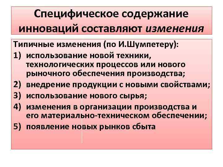 Специфическое содержание инноваций составляют изменения Типичные изменения (по И. Шумпетеру): 1) использование новой техники, технологических процессов или нового рыночного обеспечения производства; 2) внедрение продукции с новыми свойствами; 3) использование нового сырья; 4) изменения в организации производства и его материально-техническом обеспечении; 5) появление новых рынков сбыта
