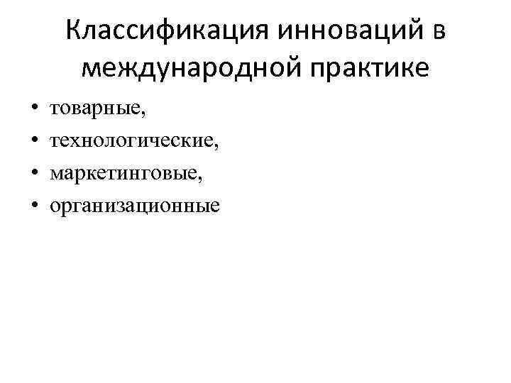 Классификация инноваций в международной практике • • товарные, технологические, маркетинговые, организационные