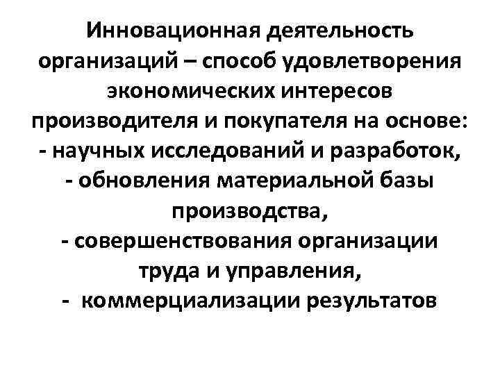 Инновационная деятельность организаций – способ удовлетворения экономических интересов производителя и покупателя на основе: - научных исследований и разработок, - обновления материальной базы производства, - совершенствования организации труда и управления, - коммерциализации результатов