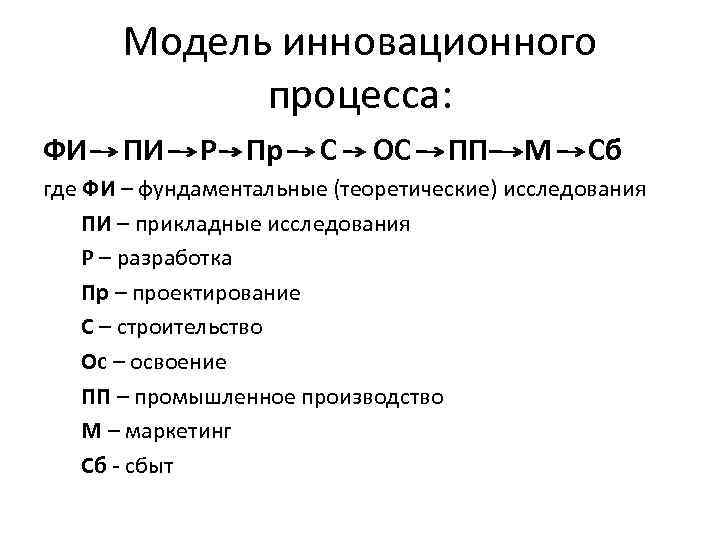 Модель инновационного процесса: ФИ ПИ Р Пр С ОС ПП М Сб где ФИ – фундаментальные (теоретические) исследования ПИ – прикладные исследования Р – разработка Пр – проектирование С – строительство Ос – освоение ПП – промышленное производство М – маркетинг Сб - сбыт