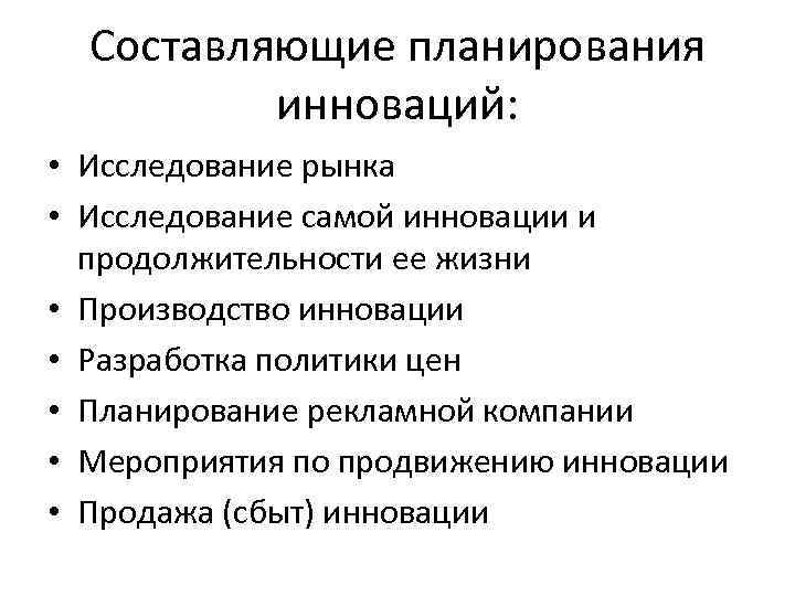 Составляющие планирования инноваций: • Исследование рынка • Исследование самой инновации и продолжительности ее жизни • Производство инновации • Разработка политики цен • Планирование рекламной компании • Мероприятия по продвижению инновации • Продажа (сбыт) инновации