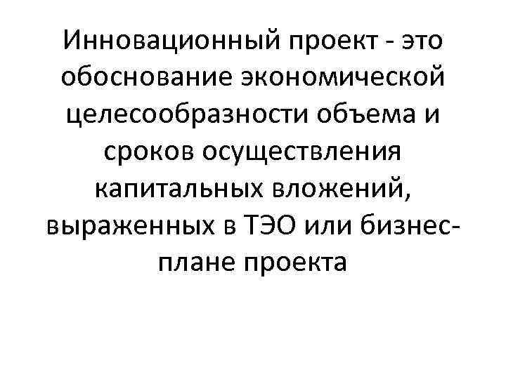 Инновационный проект - это обоснование экономической целесообразности объема и сроков осуществления капитальных вложений, выраженных в ТЭО или бизнесплане проекта