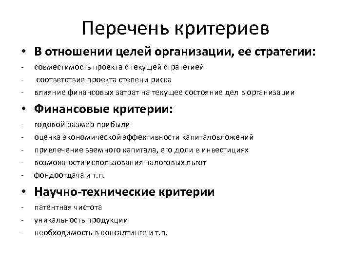 Перечень критериев • В отношении целей организации, ее стратегии: - совместимость проекта с текущей стратегией соответствие проекта степени риска влияние финансовых затрат на текущее состояние дел в организации • Финансовые критерии: - годовой размер прибыли оценка экономической эффективности капиталовложений привлечение заемного капитала, его доли в инвестициях возможности использования налоговых льгот фондоотдача и т. п. • Научно-технические критерии - патентная чистота уникальность продукции необходимость в консалтинге и т. п.