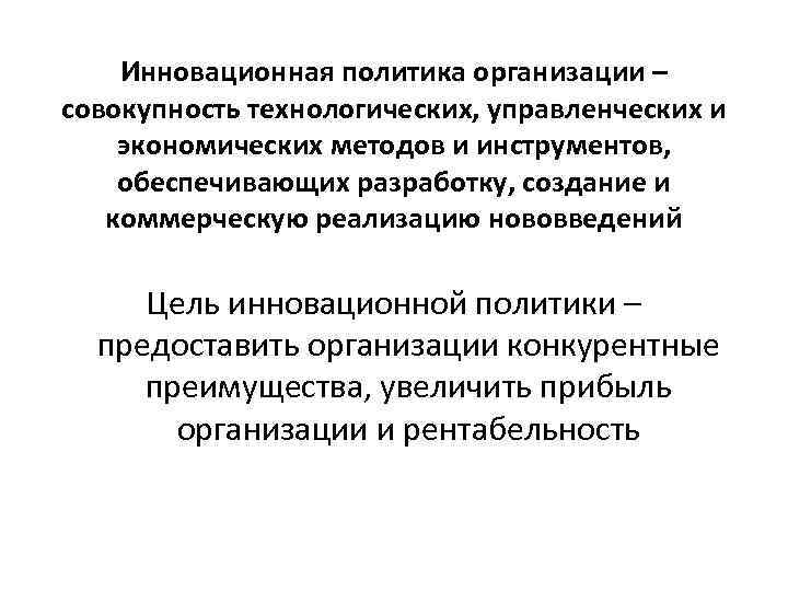Инновационная политика организации – совокупность технологических, управленческих и экономических методов и инструментов, обеспечивающих разработку, создание и коммерческую реализацию нововведений Цель инновационной политики – предоставить организации конкурентные преимущества, увеличить прибыль организации и рентабельность