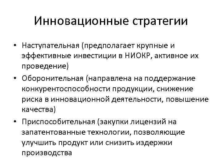 Инновационные стратегии • Наступательная (предполагает крупные и эффективные инвестиции в НИОКР, активное их проведение) • Оборонительная (направлена на поддержание конкурентоспособности продукции, снижение риска в инновационной деятельности, повышение качества) • Приспособительная (закупки лицензий на запатентованные технологии, позволяющие улучшить продукт или снизить издержки производства