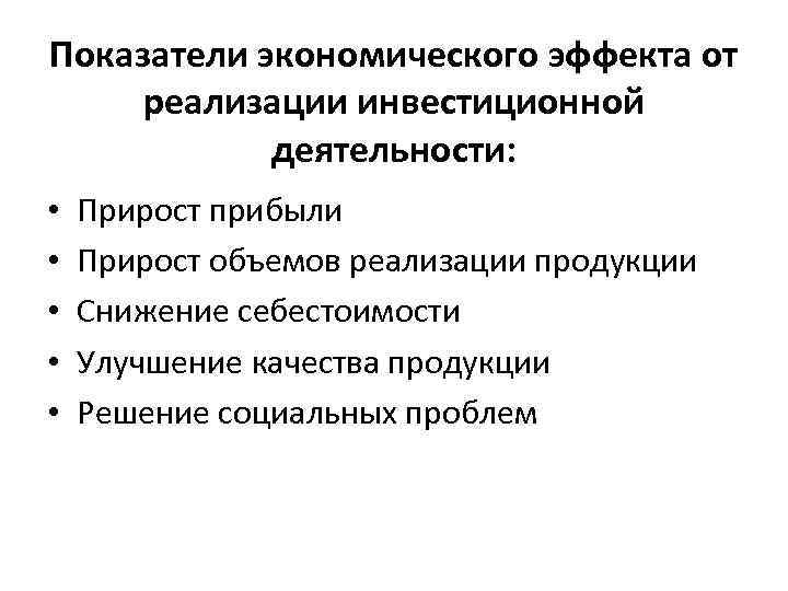 Показатели экономического эффекта от реализации инвестиционной деятельности: • • • Прирост прибыли Прирост объемов реализации продукции Снижение себестоимости Улучшение качества продукции Решение социальных проблем