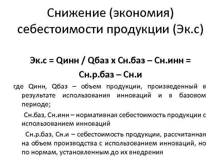 Снижение (экономия) себестоимости продукции (Эк. с) Эк. с = Qинн / Qбаз х Сн. баз – Сн. инн = Сн. р. баз – Сн. и где Qинн, Qбаз – объем продукции, произведенный в результате использования инноваций и в базовом периоде; Сн. баз, Сн. инн – нормативная себестоимость продукции с использованием инноваций Сн. р. баз, Сн. и – себестоимость продукции, рассчитанная на объем производства с использованием инноваций, но по нормам, установленным до их внедрения