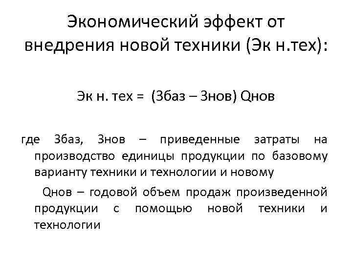 Экономический эффект от внедрения новой техники (Эк н. тех): Эк н. тех = (Збаз – Знов) Qнов где Збаз, Знов – приведенные затраты на производство единицы продукции по базовому варианту техники и технологии и новому Qнов – годовой объем продаж произведенной продукции с помощью новой техники и технологии