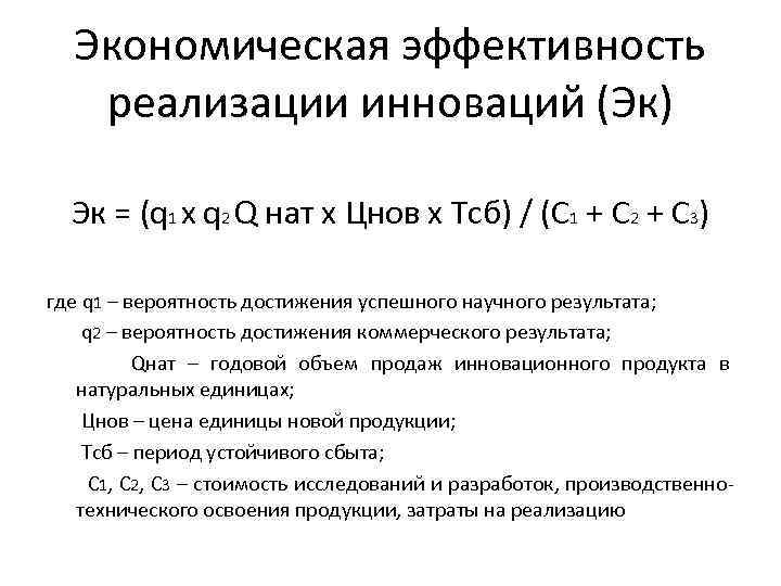 Экономическая эффективность реализации инноваций (Эк) Эк = (q 1 х q 2 Q нат х Цнов х Тсб) / (С 1 + С 2 + С 3) где q 1 – вероятность достижения успешного научного результата; q 2 – вероятность достижения коммерческого результата; Qнат – годовой объем продаж инновационного продукта в натуральных единицах; Цнов – цена единицы новой продукции; Тсб – период устойчивого сбыта; С 1, С 2, С 3 – стоимость исследований и разработок, производственнотехнического освоения продукции, затраты на реализацию