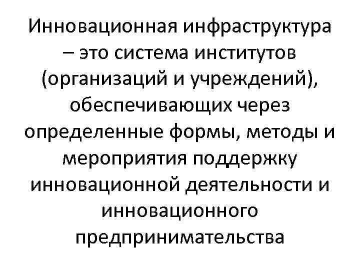 Инновационная инфраструктура – это система институтов (организаций и учреждений), обеспечивающих через определенные формы, методы и мероприятия поддержку инновационной деятельности и инновационного предпринимательства