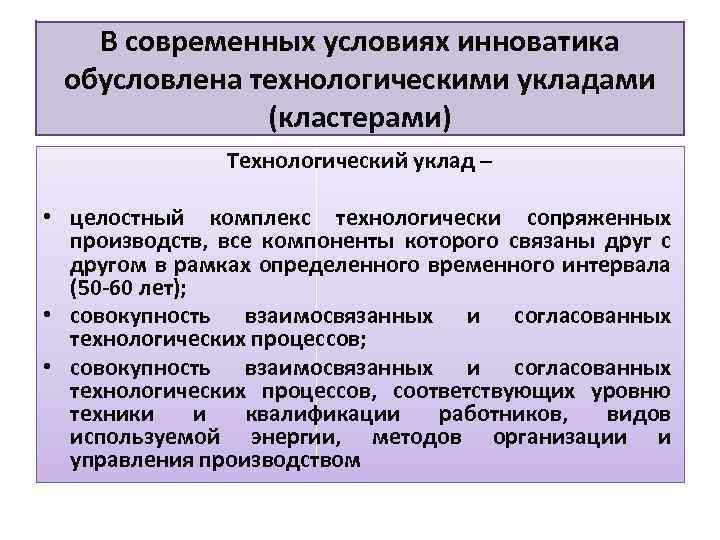 В современных условиях инноватика обусловлена технологическими укладами (кластерами) Технологический уклад – • целостный комплекс технологически сопряженных производств, все компоненты которого связаны друг с другом в рамках определенного временного интервала (50 -60 лет); • совокупность взаимосвязанных и согласованных технологических процессов, соответствующих уровню техники и квалификации работников, видов используемой энергии, методов организации и управления производством