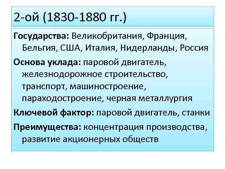 2 -ой (1830 -1880 гг. ) Государства: Великобритания, Франция, Бельгия, США, Италия, Нидерланды, Россия Основа уклада: паровой двигатель, железнодорожное строительство, транспорт, машиностроение, параходостроение, черная металлургия Ключевой фактор: паровой двигатель, станки Преимущества: концентрация производства, развитие акционерных обществ