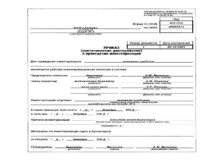 В ЗАО «Актив» в соответствии с приказом о проведении инвентаризации № 1 от 03. 12. 2006 г. необходимо провести плановую инвентаризацию основных средств на складе № 3 с 4 по 4 декабря 2006 г. Материалы по инвентаризации необходимо сдать в бухгалтерию не позднее 05. 12. 2006 г. Состав инвентаризационной комиссии: Председатель – директор А. И. Васильев Члены комиссии: технический директор А. И. Новиков, начальник цеха С. С. Петров