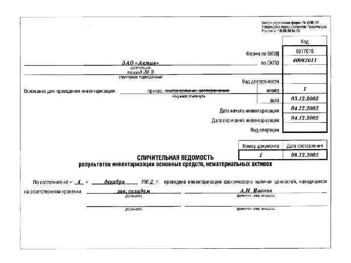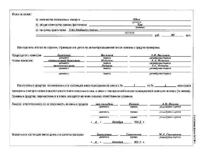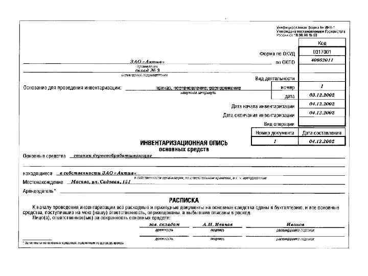 Инвентаризационная опись основных средств (форма N ИНВ-1) Применяется для оформления данных инвентаризации основных средств (зданий, сооружений, передаточных устройств машин и оборудования, транспортных средств, инструмента, вычислительной техники, производственного и хозяйственного инвентаря и т. п. ). Инвентаризационная опись составляется в двух экземплярах и подписывается ответственными лицами комиссии отдельно по каждому месту хранения ценностей и лицом, ответственным за сохранность основных средств. Один экземпляр передается в бухгалтерию для составления сличительной ведомости, а второй - остается у материально ответственного (ых) лица (лиц). До начала инвентаризации от каждого лица или группы лиц, отвечающих за сохранность ценностей, берется расписка. Расписка включена в заголовочную часть формы. В описи ответственное лицо комиссии заполняет графу 10 о фактическом наличии объектов. При выявлении объектов, которые не отражены в учете, а также объектов, по которым отсутствуют данные, характеризующие их, ответственные лица комиссии должны включить в инвентаризационную опись недостающие сведения и технические показатели по этим объектам. По решению инвентаризационной комиссии эти объекты должны быть оприходованы. В этом случае их первоначальную стоимость определяют с учетом рыночных цен, а сумму износа определяют по техническому состоянию объектов с обязательным оформлением соответствующих актов. Описи составляются отдельно по группам основных средств (производственного и непроизводственного назначения). Графа 9 "Номер паспорта" заполняется на основные средства, содержащие драгоценные металлы и камни. На основные средства, принятые в аренду, опись составляется в трех экземплярах отдельно по каждому арендодателю с указанием срока аренды. Один экземпляр инвентаризационной описи высылают в адрес арендодателя.