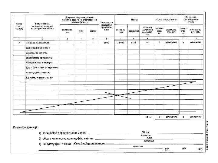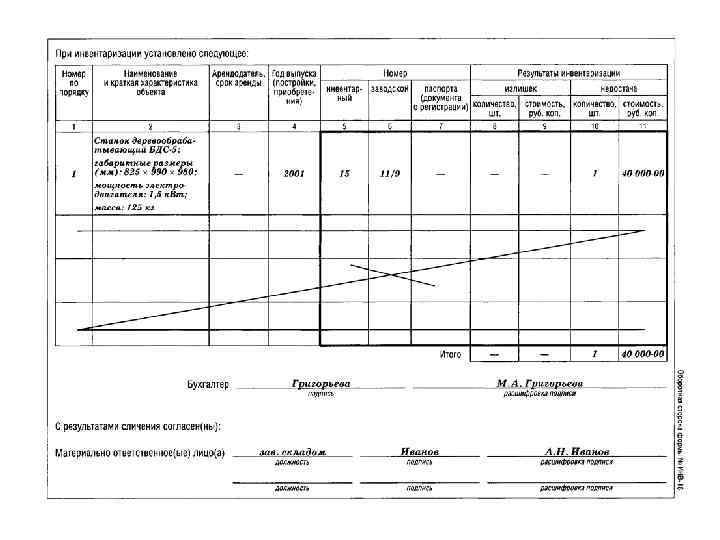Характеристика объекта: станки деревообрабатывающие БДС-5, предназначен для обработки древесины. Габаритные размеры: 825 х990 х980. Мощность электродвигателя: 1, 5 к. Вт, масса – 125 кг. Год выпуска 2001. Инвентаризационный номер: 12 -15, заводской номер – 11/9. Местонахождение ЗАО «Актив» - Москва, ул. Садовая, 151. Материально ответственное лицо – зав. складом А. И. Иванов Фактическое наличие – 3 шт. , по данным бухгалтерского учета – 4 шт. Цена: 40 000 руб. за шт. Проверку описи произвела бухгалтер М. А. Григорьева 05. 12. 2006 г.