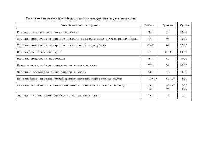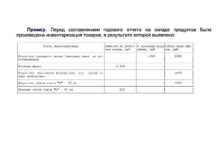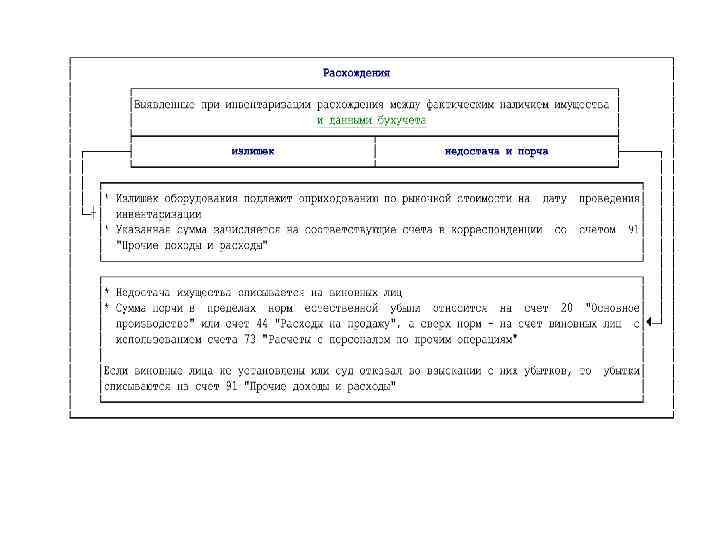 4. Выявленные при инвентаризации расхождения между фактическим наличием объектов и данными регистров бухгалтерского учета подлежат регистрации в бухгалтерском учете в том отчетном периоде, к которому относится дата, по состоянию на которую проводилась инвентаризация. Выявленные при инвентаризации расхождения между фактическим наличием имущества и данными бухгалтерского учета отражаются на счетах бухгалтерского учета в следующем порядке: n а) излишек имущества приходуется, и соответствующая сумма зачисляется на финансовые результаты организации, а у бюджетной организации - на увеличение финансирования (фондов); n б) недостача имущества и его порча в пределах норм естественной убыли относятся на издержки производства или обращения, сверх норм - на счет виновных лиц. Если виновные лица не установлены или суд отказал во взыскании убытков с них, то убытки от недостачи имущества и его порчи списываются на финансовые результаты организации, а у бюджетной организации - на уменьшение финансирования (фондов)