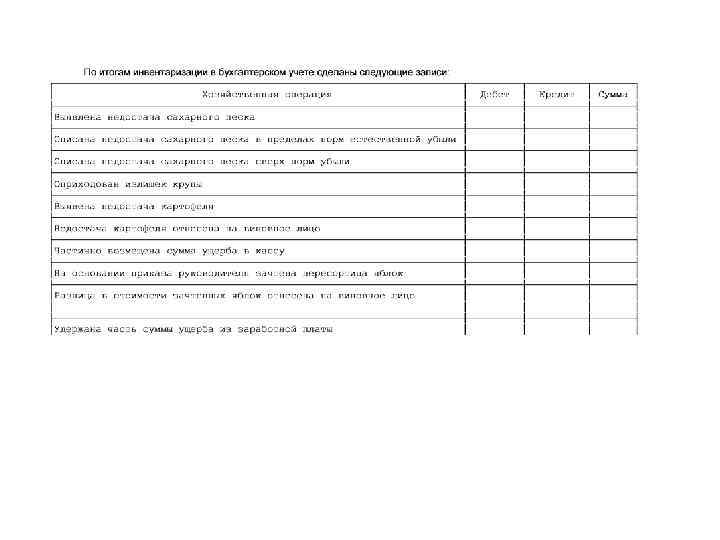4) заключительные мероприятия – n оформление ведомости учета результатов, выявленных инвентаризацией по форме N ИНВ-26; n внесение бухгалтерских записей в учетные регистры по результатам инвентаризации; nиздание приказа руководителя об утверждении результатов инвентаризации и привлечении к административной ответственности виновных лиц.