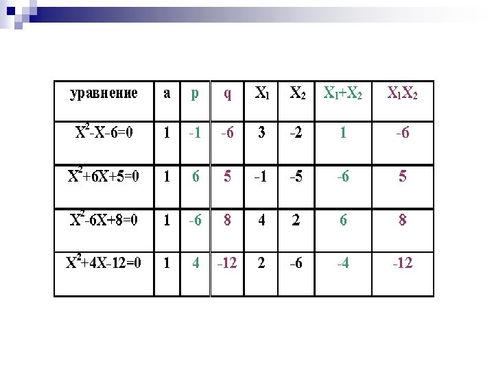 Теорема Виета: Числа х1 и х2 являются корнями приведенного квадратного уравнения х2 + pх + q = 0 тогда и только тогда, когда х1 +х2 = -p, х1 х2 = q. Следствие: х2 + pх + q=(х-х1)(х-х2).