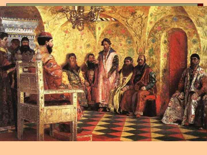 Эволюция высших органов управления при Иване IV + Боярская дума Ближняя дума (Избранная рада) Расширен состав + Правительство реформ Для ослабления позиции крупнейших боярских родов Земский собор На основе Собора примирения