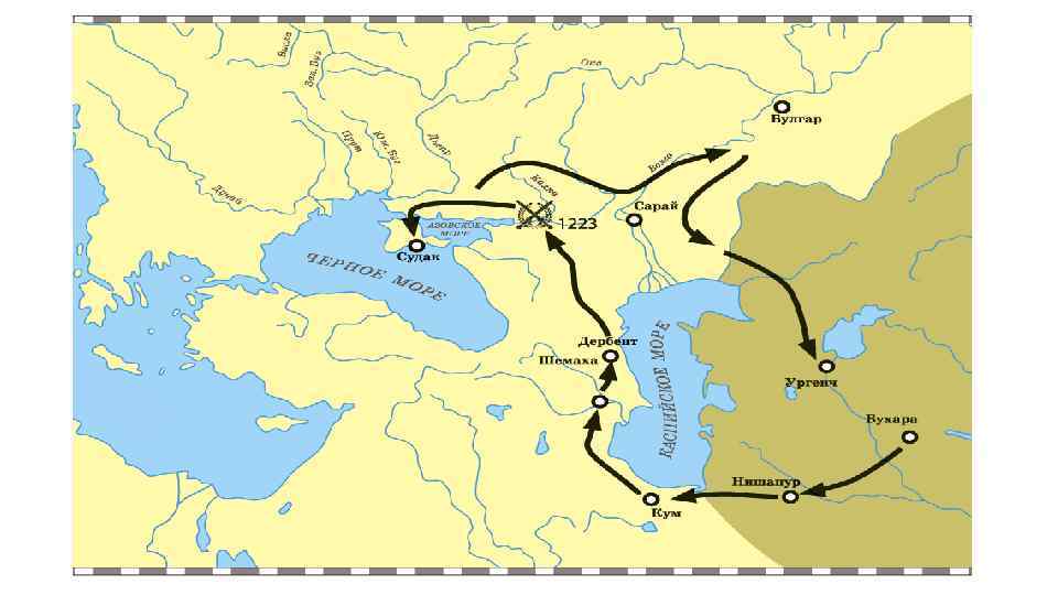 ТЕМА. История РОССИИ. Ордынский период (1238 г. по 1462 ) Ордынское (татаро-монгольское, батыево) завоевание принесло много бед и страданий Руси, но в то же время оно продемонстрировало жизнеспособность страны, которая выдержала ужасное испытание и сумела создать (или воссоздать старую с новыми признаками и свойствами? ? ) новую государственность вместо прежней, погибшей. Накануне нашествия единого государства не существовало. На базе Киевской Руси возникло до 250 княжеств, земель. Но эту страну, не государство, по-прежнему объединял язык, культура, религия, родственные связи властителей (династии Рюриковичей). БИТВА НА КАЛКЕ (1223 г. )