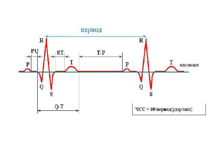 Процесс формирования ЭКГ • • В норме возбуждение распространяется по предсердиям сверху вниз. Вначале возбуждается правое предсердие. Деполяризация предсердий регистрируется на ЭКГ в виде зубца Р. Процесс реполяризации предсердий имеет минимальное значение потенциала на поверхности тела, на ЭКГ он соответствует интервалу от конца зубца Р до начала комплекса QRS. Процесс деполяризации желудочков миокарда на ЭКГ регистрируется в виде комплекса зубцов QRS. Процесс быстрой конечной реполяризации желудочков соответствует на ЭКГ зубцу Т. Таким образом, на ЭКГ имеется характерные по форме волны: зубец P, комплекс QRS и зубец Т (рис. 7), разделенные участками нулевого потенциала (в эти периоды потенциалы на различных участках сердечной мышцы взаимно компенсируются). Эти волны соответствуют трём петлям, которые описывает конец ИЭВС за цикл работы сердца.