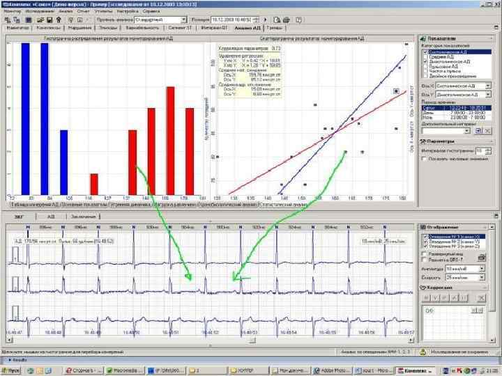 Результаты холтеровского мониторирования ЭКГ представляются в виде таблиц и графиков. Любые табличные и графические данные синхронизированы по времени с соответствующими интервалами или комплексами ЭКГ. Данные или области для редактирования доступны из таблиц, графиков или записи ЭКГ сигнала. Возможно снимать ЭКГ покоя и проводить пробы с физической нагрузкой. Обрабатывающая программа компьютера обеспечивает быстрый анализ ЭКГ и/или АД. Возникает множество болезней от курения табака. Регулярное употребление никотина, как известно, является одной из главных причин болезни кровеносных сосудов. Курение оказывает действие на кровеносные сосуды, вследствие чего, они начинают сужаться, и появляются изменение на их стенках, что приводит к заболеванию атеросклерозам. Сужение сосудов происходит из-за того, что их внутренняя оболочка начинает усиленно разрастаться, это приводит к тому, что участки тела, более отдалѐнные от сердца, а это, прежде всего ноги, они начинаю плохо снабжаться кровью, что в конечно результате может привести даже к гангрене.