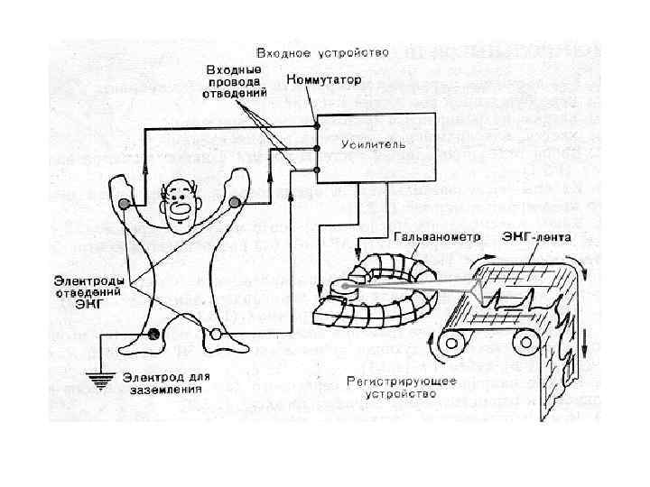 ЭЛЕКТРОКАРДИОГРАФ Приборы, регистрирующие изменение разности потенциалов между двумя точками в электрическом поле сердца называются электрокардиографами. Разность потенциалов, возникающая на поверхности тела, регистрируется с помощью системы металлических электродов, укрепленных на участках тела резиновыми ремнями. Через входные провода сигнал подается на коммутатор, а затем на вход усилителя. Малое напряжение усиливается во много раз и подается в регистрирующее устройство, где электрические колебания преобразуются в механические смещения и записываются на движущейся ленте. Лентопротяжные механизмы в электрокардиографах обеспечивают движение бумаги со скоростью 25 мм/с и 50 мм/с (при скорости 50 мм/с ЭКГ будет более растянута во времени). Современные цифровые кардиографы печатают электрокардиограмму на неподвижном листе.
