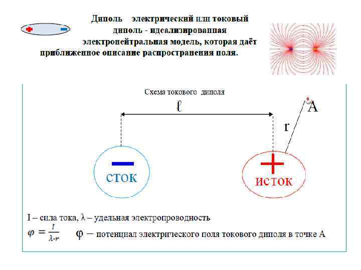 • Электрокардиография основывается на теории Эйнтховена, которая позволяет судить о биопотенциале сердца косвенно, путем измерения потенциалов в определенных точках на поверхности тела человека. • Электрические явления, возникающие на поверхности возбудимой среды (волокна сердца), принято описывать с помощью понятия токового электрического диполя. Токовым электрическим диполем (дипольным электрическим генератором) называется двухполюсная система, состоящая из положительного полюса – истока (участок покоя) и отрицательного полюса – стока (возбуждённый участок), в которой поддерживается электрический ток. Для описания токового диполя вводится вектор – дипольный момент: • I – сила тока, l- расстояние между истоком и стоком. Условно принято считать, что вектор дипольного момента направлен от отрицательного полюса к положительному.