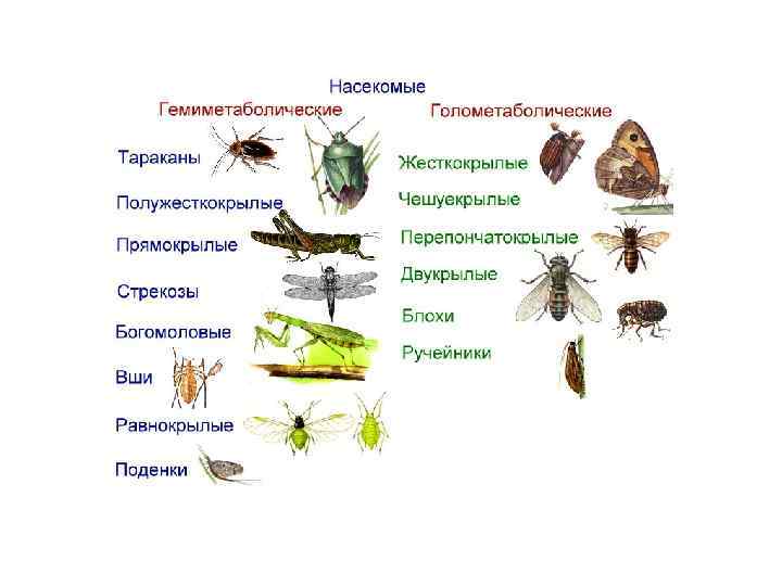 Повторение Отряды насекомых Стрекозы Прямокрылые Равнокрылые Полужесткокрылые Чешуекрылые Жесткокрылые Двукрылые Перепончатокрылые Тип развития Ротовой аппарат