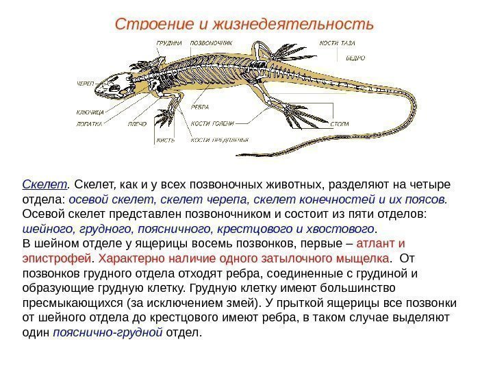 Строение и жизнедеятельность Скелет, как и у всех позвоночных животных, разделяют на четыре отдела: осевой скелет, скелет черепа, скелет конечностей и их поясов. Осевой скелет представлен позвоночником и состоит из пяти отделов: шейного, грудного, поясничного, крестцового и хвостового. В шейном отделе у ящерицы восемь позвонков, первые – атлант и эпистрофей. Характерно наличие одного затылочного мыщелка. От позвонков грудного отдела отходят ребра, соединенные с грудиной и образующие грудную клетку. Грудную клетку имеют большинство пресмыкающихся (за исключением змей). У прыткой ящерицы все позвонки от шейного отдела до крестцового имеют ребра, в таком случае выделяют один пояснично-грудной отдел.