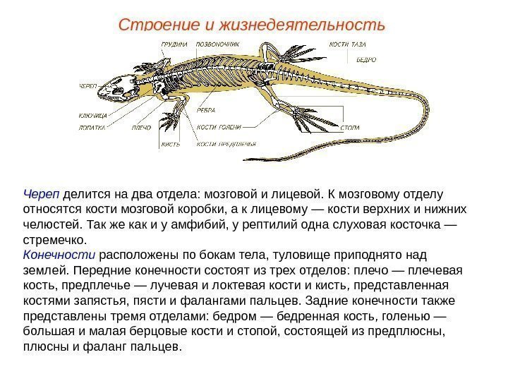 Строение и жизнедеятельность Череп делится на два отдела: мозговой и лицевой. К мозговому отделу относятся кости мозговой коробки, а к лицевому — кости верхних и нижних челюстей. Так же как и у амфибий, у рептилий одна слуховая косточка — стремечко. Конечности расположены по бокам тела, туловище приподнято над землей. Передние конечности состоят из трех отделов: плечо — плечевая кость, предплечье — лучевая и локтевая кости и кисть, представленная костями запястья, пясти и фалангами пальцев. Задние конечности также представлены тремя отделами: бедром — бедренная кость, голенью — большая и малая берцовые кости и стопой, состоящей из предплюсны, плюсны и фаланг пальцев.