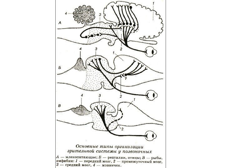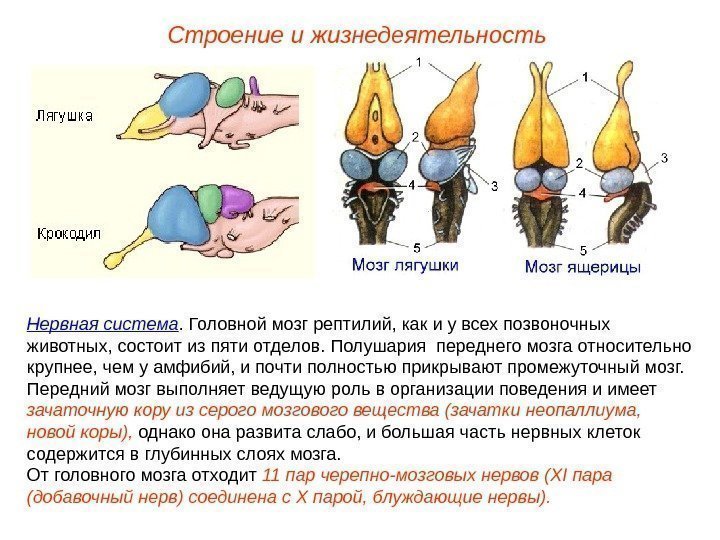 Строение и жизнедеятельность Нервная система. Головной мозг рептилий, как и у всех позвоночных животных, состоит из пяти отделов. Полушария переднего мозга относительно крупнее, чем у амфибий, и почти полностью прикрывают промежуточный мозг. Передний мозг выполняет ведущую роль в организации поведения и имеет зачаточную кору из серого мозгового вещества (зачатки неопаллиума, новой коры), однако она развита слабо, и большая часть нервных клеток содержится в глубинных слоях мозга. От головного мозга отходит 11 пар черепно-мозговых нервов (Х I пара (добавочный нерв) соединена с Х парой, блуждающие нервы).