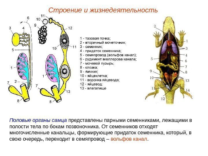 Строение и жизнедеятельность Половые органы самца представлены парными семенниками, лежащими в полости тела по бокам позвоночника. От семенников отходят многочисленные канальцы, формирующие придаток семенника, который, в свою очередь, переходит в семяпровод – вольфов канал.