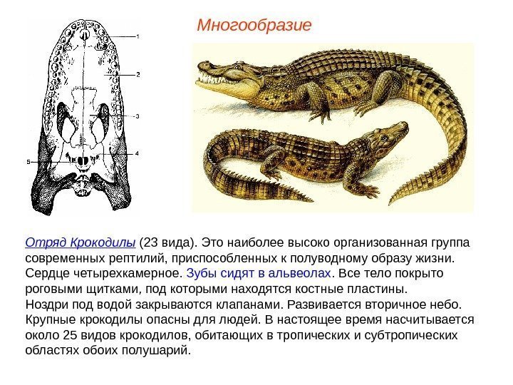 Многообразие Отряд Крокодилы (23 вида). Это наиболее высоко организованная группа современных рептилий, приспособленных к полуводному образу жизни. Сердце четырехкамерное. Зубы сидят в альвеолах. Все тело покрыто роговыми щитками, под которыми находятся костные пластины. Ноздри под водой закрываются клапанами. Развивается вторичное небо. Крупные крокодилы опасны для людей. В настоящее время насчитывается около 25 видов крокодилов, обитающих в тропических и субтропических областях обоих полушарий.