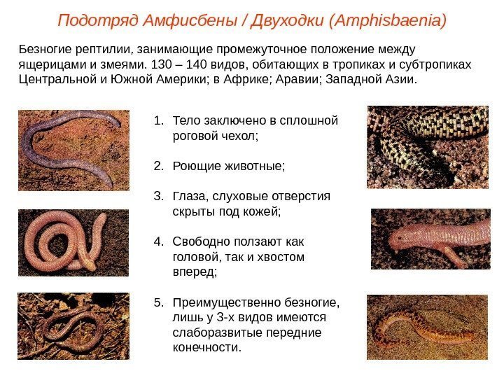Подотряд Амфисбены / Двуходки ( Amphisbaenia ) Безногие рептилии, занимающие промежуточное положение между ящерицами и змеями. 130 – 140 видов, обитающих в тропиках и субтропиках Центральной и Южной Америки; в Африке; Аравии; Западной Азии. 1. Тело заключено в сплошной роговой чехол; 2. Роющие животные; 3. Глаза, слуховые отверстия скрыты под кожей; 4. Свободно ползают как головой, так и хвостом вперед; 5. Преимущественно безногие, лишь у 3 -х видов имеются слаборазвитые передние конечности.