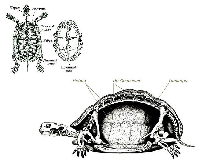 Многообразие Отряд Черепахи (250 видов). Это наиболее необычная группа рептилий, характерной особенностью которых является наличие панциря. Панцирь состоит из брюшного и спинного щита, связанных сухожильной связкой, либо прочно сращенных костной перемычкой. Спинной щит — карапакс — состоит из ребер и большей части позвоночника, слившихся друг с другом и с костными пластинами, образованными кожей. Брюшной щит — пластрон — образован также костными пластинами кожного происхождения, слившимися с грудиной и ключицами. Панцирь большинства черепах покрыт роговыми щитками. Кроме того, для черепах характерно отсутствие зубов, их челюсти покрыты роговыми чехлами.