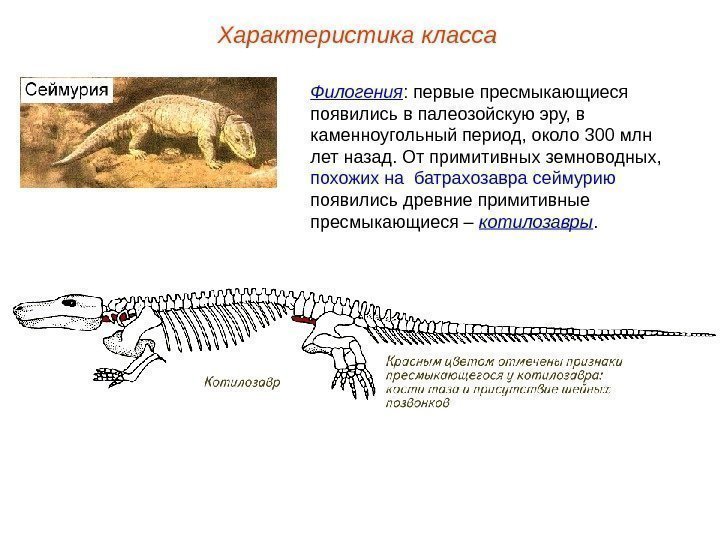 Характеристика класса Филогения : первые пресмыкающиеся появились в палеозойскую эру, в каменноугольный период, около 300 млн лет назад. От примитивных земноводных, похожих на батрахозавра сеймурию появились древние примитивные пресмыкающиеся – котилозавры.
